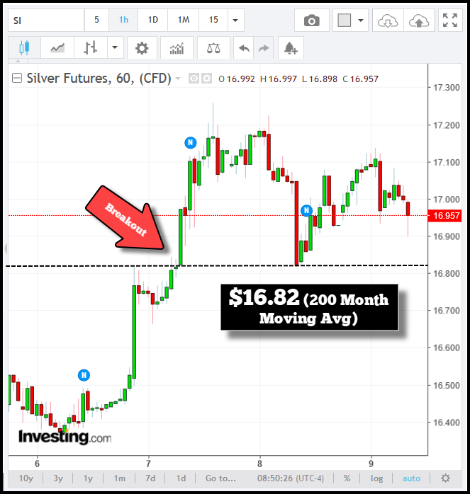When the silver price first approached that key $16.82 level during Asian trading Tuesday night, it touched it several times and bounced off of it and corrected lower. Then in the next chart, we can see that as the silver price finally broke above that $16.82, it enjoyed a MINI-BREAKOUT to $17.00, and then eventually to $17.20:
