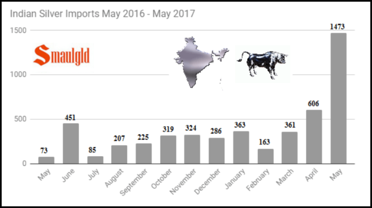 FIRST DEVELOPMENT: Let’s start off with showing the stunning amount of silver India imported in May. According to Smaulgld.com, India imported nearly 2,000% more silver in May 2017 vs May 2016: