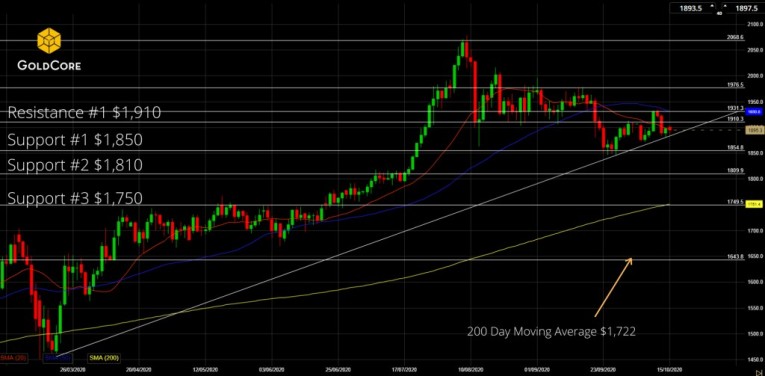Corvid 19, the US Election and US Financial Stimulus talks have given gold plenty to digest over the last week. On a short term basis gold has been taking a lot of signal from the fortunes of the stock markets and increased hopes of agreement of a financial stimulus package gave a boost to both stock markets and the gold price. Gold ran in to significant resistance and failed to close above the short term resistance level around $1,930 and close to the 50 day moving average as can been seen from the chart below.