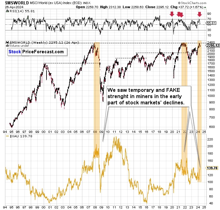The above chart features world stocks and the orange rectangles show moments when we saw FAKE strength in miners. If you compare the above chart with the copper chart, you’ll see that these were times when copper was “strong” (before sliding) as well.