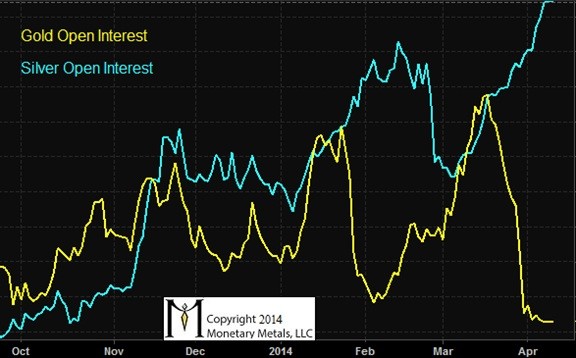 The picture is clear enough. Since the beginning of fall, the number of gold contracts has blipped up and down and now there are somewhat fewer (-3.7%). Meanwhile, the number of silver contracts has gone up substantially (+39%).