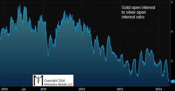 There is an unmistakable downward trend since the middle of 2010, almost 4 years ago. Then, there were about five gold contracts for every silver contract. Today, the ratio is down to two.