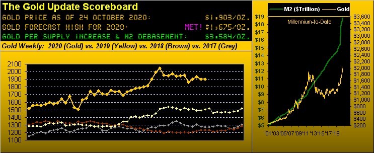 'Course it then all whirled right back 'round upon the senator surprisingly being trumped and the media's credibility being thumped. Then above on the right, fast-forward four years to today and the pre-election panic of 2016 is not on the 2020 screen. Oh to be sure, the S&P is seeing some negative tilt -- and as regular readers know we've long-sensed the stock market is a "sell" regardless of this year's election results -- but hardly is there a rush into Gold. In fact, three weeks ago Gold settled at 1904; following a brief bound two weeks ago to 1936, price then settled one week ago at 1903; and now this past week it closed net "unch" at 1903.