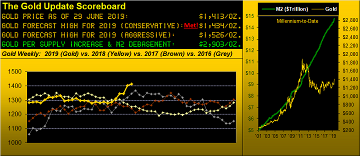 Indeed following Gold's monumental setback from the years 2011 through 2015, price then spent 2016 through 2018 directionlessly thrashing about as would a wayward weasel upon a heat shimmerin' Georgia highway. But come this year amongst Fed musings of rate relenting, recognition of the Economic Barometer's sliding for a full year, (Chair Powell himself noting this past week to the Council on Foreign Relations that the economy is facing growing uncertainties), dashes of geopolitical discourse, the 3Ds of Debasement, Debt and Derivatives actually making mainstream media coverage, (plus we'd like to think our weekly reminding that Gold today "ought be" at nearly 3000 simply to get re-aligned with the StateSide money supply), and --- "Jump back, Loretta!" -- Gold in 2019 is getting a bone fide bid. 'Tis clearly the case since price vaulted up outta The Box (1280-1240) just five weeks for a gain since then (from 1280 through this past week's high at 1442) of 12.7% before settling yesterday (Friday) at 1413.