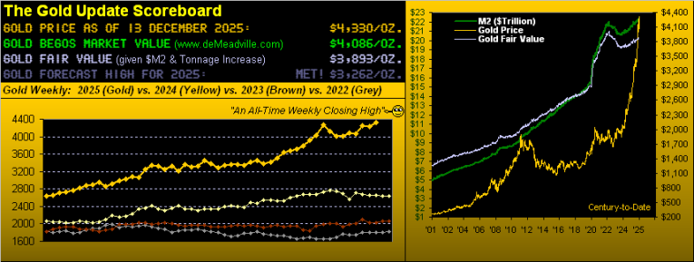 However, ’tis actually not magic; rather ’tis math that makes the next graphic’s newly-encircled blue dot appear. And today priced at 4330, Gold in 2025 is +64%, with the All-Time Intraday High from 20 October still in place at 4398. As for the just “failed” Short trend of only three red-dotted weeks, it opened on Monday 24 November at 4069 and was snuffed out yesterday at 4330. (Reminder: “Shorting Gold is a bad idea”). Rather, we’re “pleased as punch” indeed, HHH: