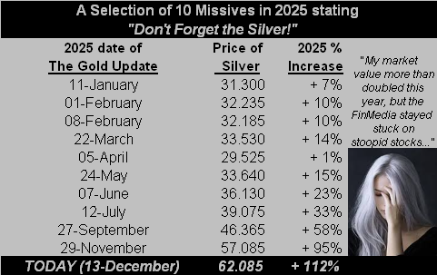 Direct from our “‘Don’t Forget the Silver!’ Dept.” — the white metal soaring well-above 60 this past week (as posted Tuesday on “X” via @deMeadvillePro) — we present the following table, remindful of that herein stated ad nauseam throughout this year, (indeed across recent years prior):