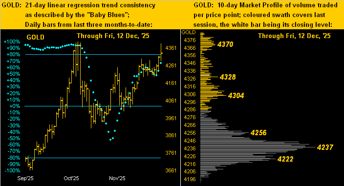 ‘Course, just as Gold had relevance for the Egyptians ’round 3000 BC, so does it today. And as we go to the yellow metal’s two-panel graphic featuring the daily bars from three months-ago-date on the left and 10-day Market Profile on the right, ’tis quite the healthy picture. The baby blue dots of regression trend consistency after a wee stumble are renewing their upside push, whilst the Profile shows heavily-dominant volume support at the labeled 4237 apex: