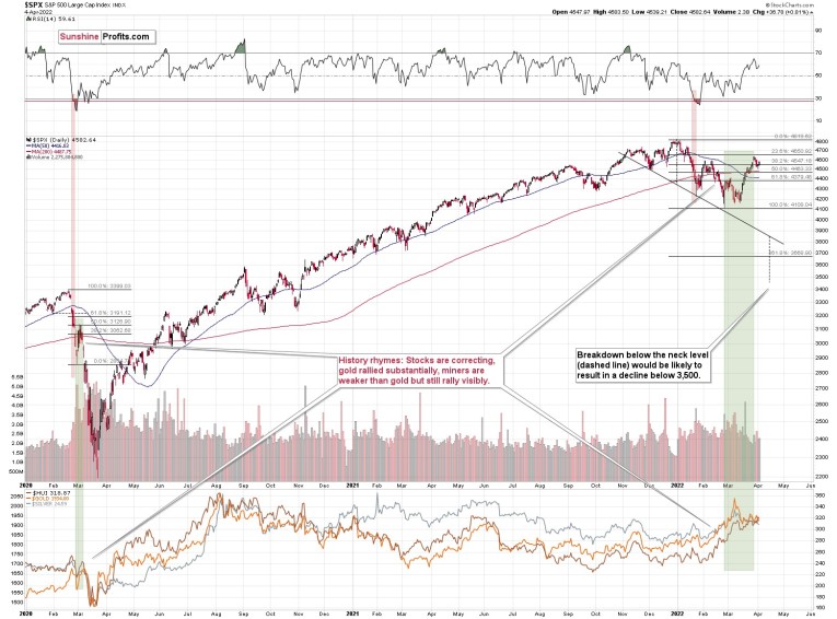 The general stock market closed the week below its February highs, which means that the small breakout above them was invalidated. This is a very bearish indication for the following weeks. Many more investors are likely to become aware of the new interest-rate-hike-driven medium-term bear market once the S&P 500 breaks to new 2022 lows. That’s when the decline is likely to accelerate, quite likely also in silver and mining stocks that are usually most vulnerable to stock market moves.