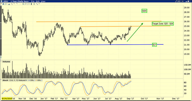 This is the fabulous GDX chart. A lot of gold stocks have arrived at my first upside target zone ($25 - $26 basis GDX), but I urge investors to keep profit booking very light and focus on building substantial gold stock core positions on all price weakness.