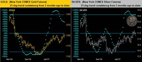Still, you know you're sensing a serious commitment to the Gold market upon seeing it stay firm despite the dropping off of late by its "Baby Blues". For as shown below left across Gold's daily bars over the last three months, even with the falling blue dots being representative of the 21-day linear regression trend losing its upside consistency, price nonetheless is braving the blues by rising against their descending grain. And as for racy Sister Silver below right, the picture is similar, albeit her blues clearly must be equipped with Formula One-type carbon-fibre disc brakes, the falling dots there having stopped on a dime: