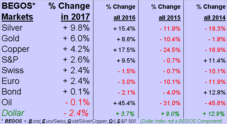 But as is their wont, our FinMedia friends are instead all again a-gaga as "The Dow" regains its five-digit milestone which begins with "2", the index itself +1.6% year-to-date. Nary a word 'bout the real leaders, (aka "The Precious Metals"), which one month plus three trading days into 2017 are leading the BEGOS Market Standings as we see here: