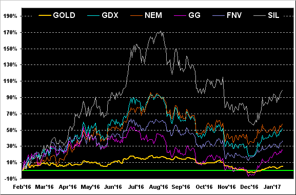 Six weeks into 2017, the above panel shows us Gold's being ahead of where 'twas over the same time frame in 2016, although the challenge of so staying appears dead ahead.