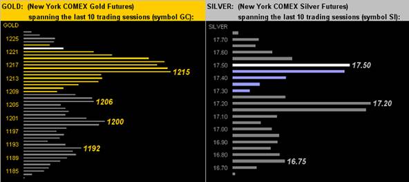 No wizardry needed here, as we've the traders who've created the following 10-day Market Profiles for both Gold (left) and Silver (right), the white bars being yesterday's (Friday's) respective closing levels of 1222 and 17.52, and the underlying support shelves at the most heavily-traded prices as labeled. Of note, when we've seen the metals toward the highest levels in their profiles, it oft seems a week hence that prices then have scampered back down; but the key of late is that the profiles themselves are pushing out to higher highs, both Gold and Silver having so done this past week in the young year-to-date:
