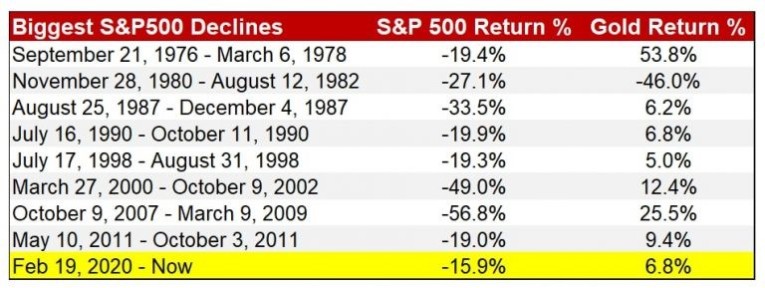 This is a chart of the S&P 500’s largest declines in the past forty years. And it shows gold’s performance in the same time frame.