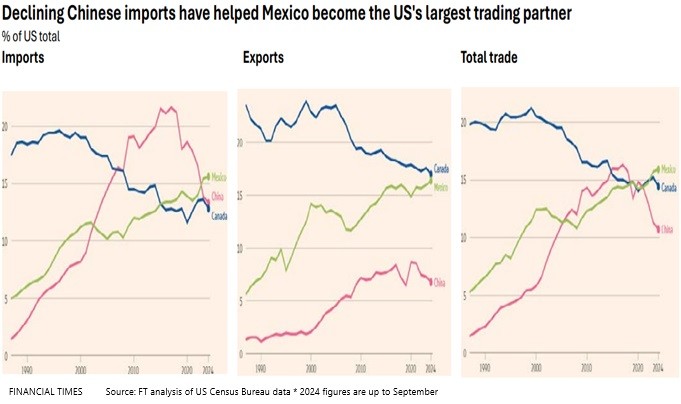 We believe that with a new sheriff in town, the mercantilist push for new levies will radically alter the post-1945 world order. Yet Mr. Trump is a transactional type and the “Art of the Deal” salesman relishes in the “give-and-take” negotiations, so make him a deal he can’t refuse might prove to be a winning strategy. While Trump’s first term triggered an adversarial approach that triggered the US-China trade war, a 60 percent tariff on some $430 billion in goods imported each year would hurt both economies and also fuel inflation. Companies have already moved from China, shifting production to Vietnam, Indonesia and Mexico. Others are stockpiling goods, holding a higher level of inventories adding to costs. On social media the president-elect’s opening salvo was to impose 25% tariffs on all imports from neighbouring Canada and Mexico which would abrogate the USMCA agreement as well as 35% tariffs on Beijing, America’s biggest trading partners. Will Trump be the deal maker or Trump the competitor?
