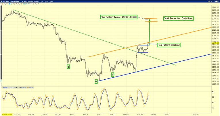 That’s also an hourly bars chart, with the uptrend channel highlighted. A rise above $1200 could usher in a lot of momentum-oriented buying, creating a near-vertical surge to the $1235 -$1240 price zone.