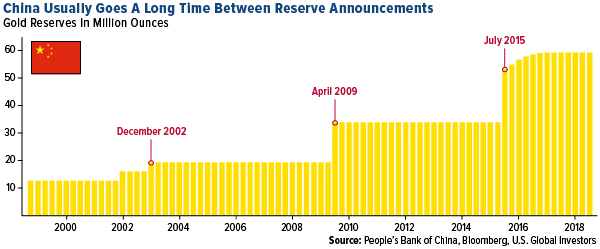 · Net imports of gold by mainland China from Hong Kong were 81,304 kilograms, which is the most since March 2017. Gold reserve holdings in China have long been a mystery, as the nation often goes years without reporting increases or decreases, but reserves could be rising. China has kept its official gold holdings unchanged at 59.24 million ounces since October 2016, valued at $74.1 billion. The growing trade war with the U.S. and a slump in gold prices are reasons that China could be buying gold.