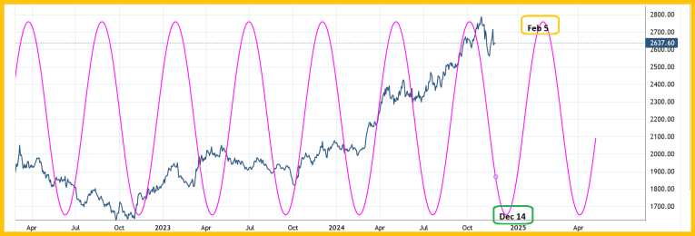 This is the four month gold cycle chart. The next low in the cycle comes around Dec 14 and the next high comes near the Chinese New Year peak at about Feb 5, 2025.