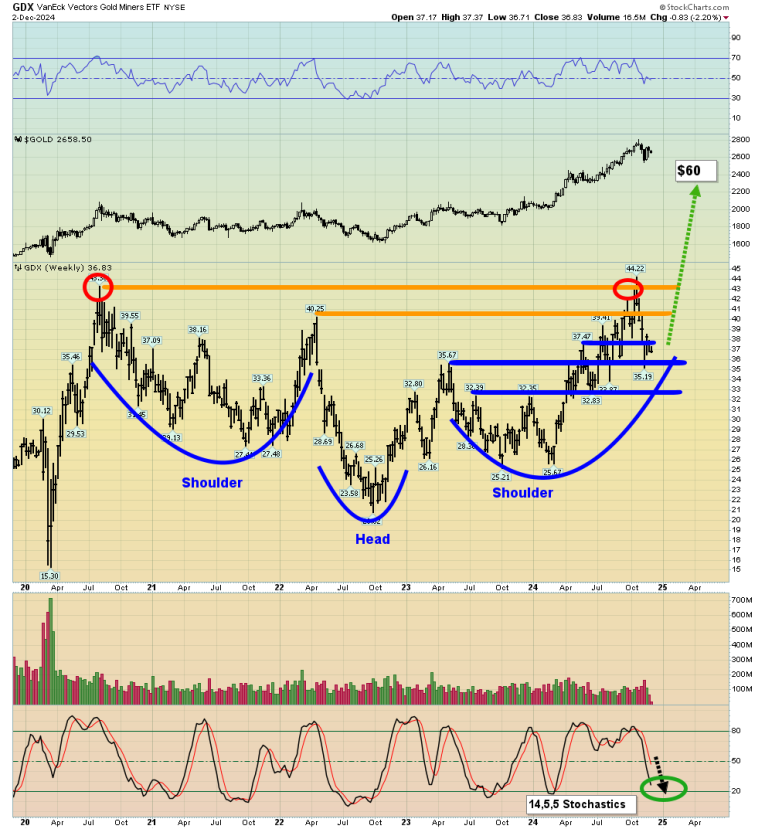 For a look at why this is important to gold and silver stock investors, note the key 14,5,5 Stochastics action at the bottom the chart. It’s approaching oversold and likely gets there just as the 4month gold cycle low occurs. A turn should help launch GDX out of the huge inverse H&S pattern… and usher in 12 to 24 months of outperformance against gold!