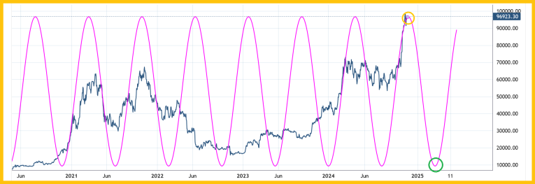 This is the 6-month cycle chart for bitcoin. Cycle analysis tends to flounder in a sideways market, but it’s quite accurate at projecting major highs… and it’s projecting one for bitcoin now.