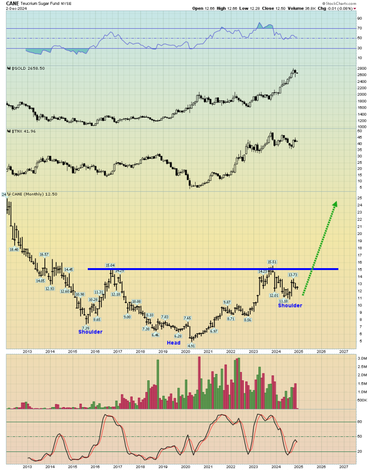 What could become to be viewed as “chart of the decade” in the years ahead. Sugar is a key indicator of Mainstreet inflation, and basis this CANE ETF, a massive inverse H&S base pattern is in play. I’m a buyer, and with some decent size.