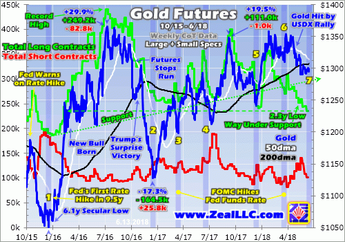 The 6th hike of this cycle came right on schedule in late March this year, accompanied by a neutral dot plot still forecasting 3 total rate hikes in 2018. But again the gold-futures traders worried leading into that FOMC decision, pushing gold 3.2% lower over the prior month or so. They started buying back in that very Fed Day, so gold sharply rebounded 3.3% higher to $1353 within 4 trading days of that Fed rate hike.