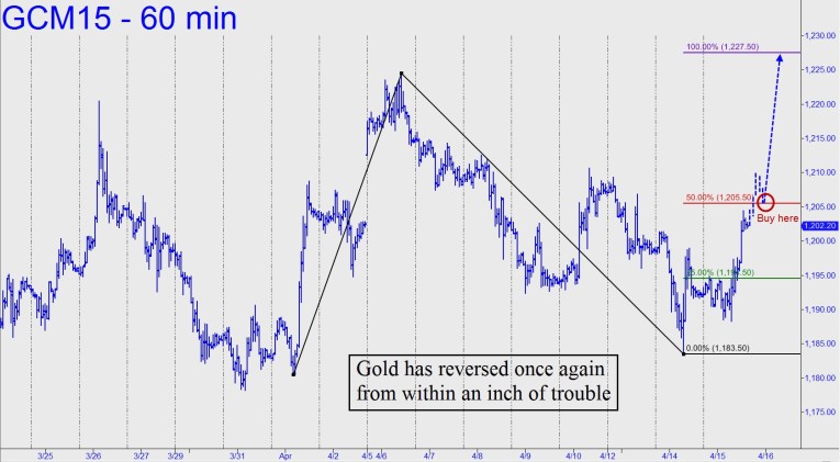 Gold has a scary habit of pulling out of its all-too-frequent kamikaze dives just before splattering on the deck, technically speaking. If, for one, yesterday’s selloff had exceeded 1187.20 to the downside, we might have expected it to continue to at least 1175.60. Instead, bulls showed up in a nick of time, turning the futures higher from 1188.30. The result was an impulsive rally on the hourly chart that has kept alive the large, bullish pattern shown. It projects to as high as 1227.50 over the near term, with only a single significant impediment between here and there: a midpoint resistance at 1205.50. To get long ahead of the move, I would suggest buying a pullback to 1205.50 after that Hidden Pivot has been exceeded decisively — i.e., by about $4-$5 (see inset). An 1198.20 stop-loss would apply. That is a ‘mechanical’ entry, and it may be best suited to those who awaken Thursday morning to see that a rally and correction have already occurred. But one could conceivably get aboard earlier, and lower, by using the ‘camouflage’ technique from current levels. As of around 5:00 p.m. EDT, the best place to look for set-ups was on the 15-minute chart. We shall see.