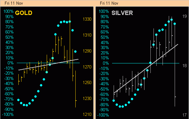 Indeed Gold has now swiftly gone quite a way down the road per this updated graphic with which we opened one week ago (when Gold was 1305.2 and Silver 18.425) through yesterday's (Friday's) settles at 1227.4 and 17.365 respectively. Watch those "Baby Blues" in animation reflect the ruination of what had been brilliant upside consistency in the 21-day linear regression trends (grey diagonal lines) for both markets. Each panel of the animation is dated at the top and spans 21 trading days: