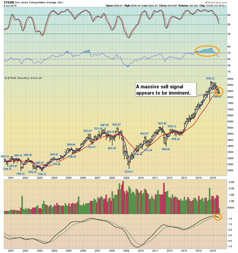 Note the emerging sell signal on the TRIX indicator on that Transports chart. The key 5,15 moving average series is also verging on a massive sell signal.
