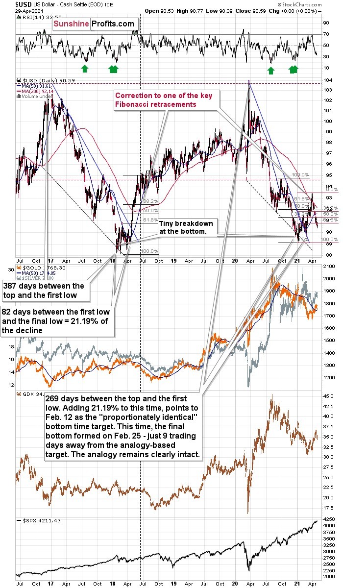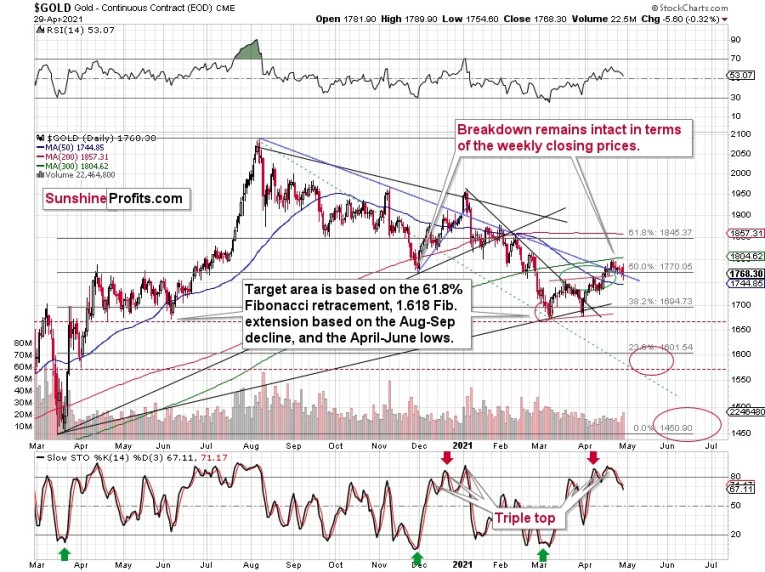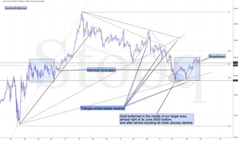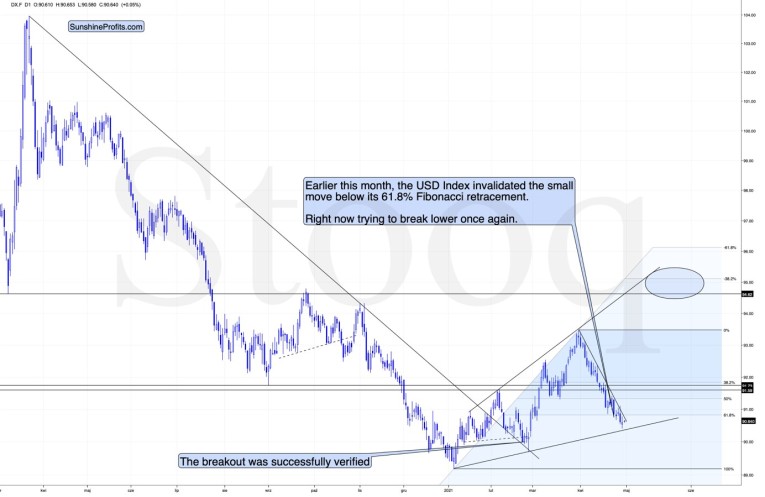 Just as was the case in early January, we first saw a pause – a rebound – and the decline continued only thereafter. It seems that the Jan. 7, 2021 price action is quite similar to what we saw yesterday (Apr. 29). Moreover, please note that both happened just above the declining blue support line. It was the final pause before the move higher was invalidated.