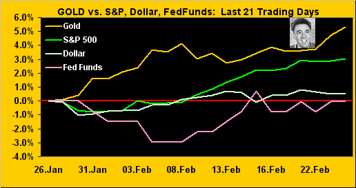 Sound commitment indeed as from our "Against All Odds Dept." comes this graphic of the percentage tracks over the last 21 trading days (one month) showing Gold rising ... as is the stock market ... as is the Dollar ... all whilst the trade of FedFunds is firm. Why, that's not supposed to happen, right? 'Tis:
