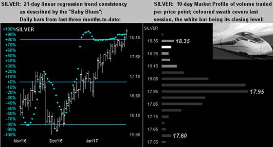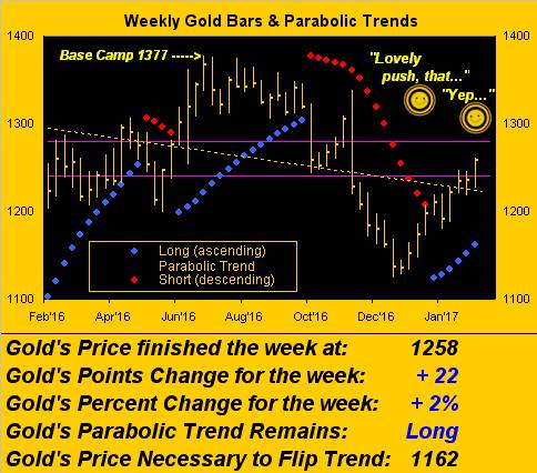 Speaking of lovely, Gold's accelerative push up into the purple-bounded 1240-1280 resistance zone was exactly so. 'Course as far back as 2013, Gold has had a fairly fiery relationship in dating this area. Hopefully the excitement of instead focusing on a return at least to Base Camp 1377 shall once and for all permanently place the following purple lines in the rear-view mirror, their then to fade away below the horizon. That said, Gold intra-year need rise at least 19.5% (from 2016's settle at 1152) to reach Base Camp 1377. In attaining that level last year, Gold was then +29.9%, which begs the question: has Gold ever made an intra-year gain of at least 20% following a year wherein 'twas +30%? Oh yes: in 1979, 1980, 1987, 2007, 2008, 2010 and 2011. So why not in 2017, eh? These weekly bars are purposefully rising at an attractive pace, the blue parabolic Long trend dots now into a six-week stint: