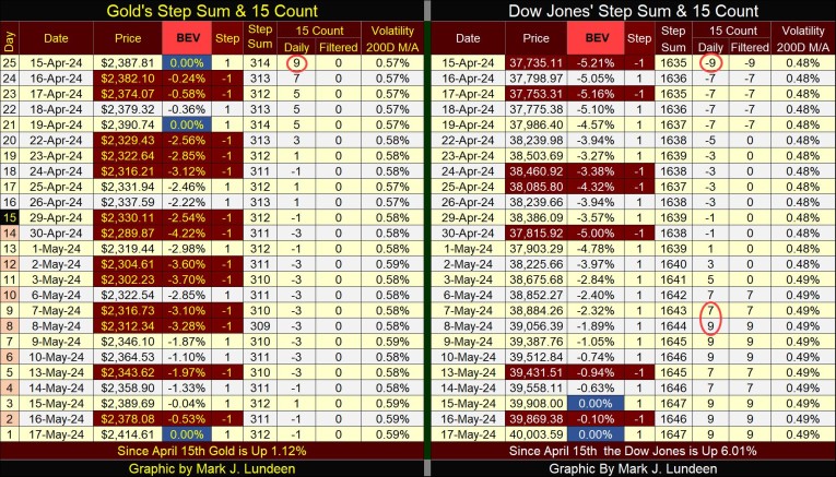 For the Dow Jones, what is seen in its step sum table isn’t as positive as what we see for gold. On April 15th, the Dow Jones’ 15-count was a -9, making the Dow Jones a very oversold market. The Dow Jones doesn’t like being very oversold, so expecting the Dow Jones would soon see a period where daily advances would outnumber daily declines was in order, and in fact happened.