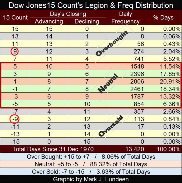 For your information, below is a table giving the values for a 15-count, and their frequencies for the Dow Jones since 31 December 1970. For the Dow Jones, having a 15-count of -9 has happened on only 113 daily closes since 1970, or 0.84% of the 13,420 of NYSE Trading sessions of the past fifty-three years. So yes, a 15-count of -9 for the Dow Jones is very oversold.