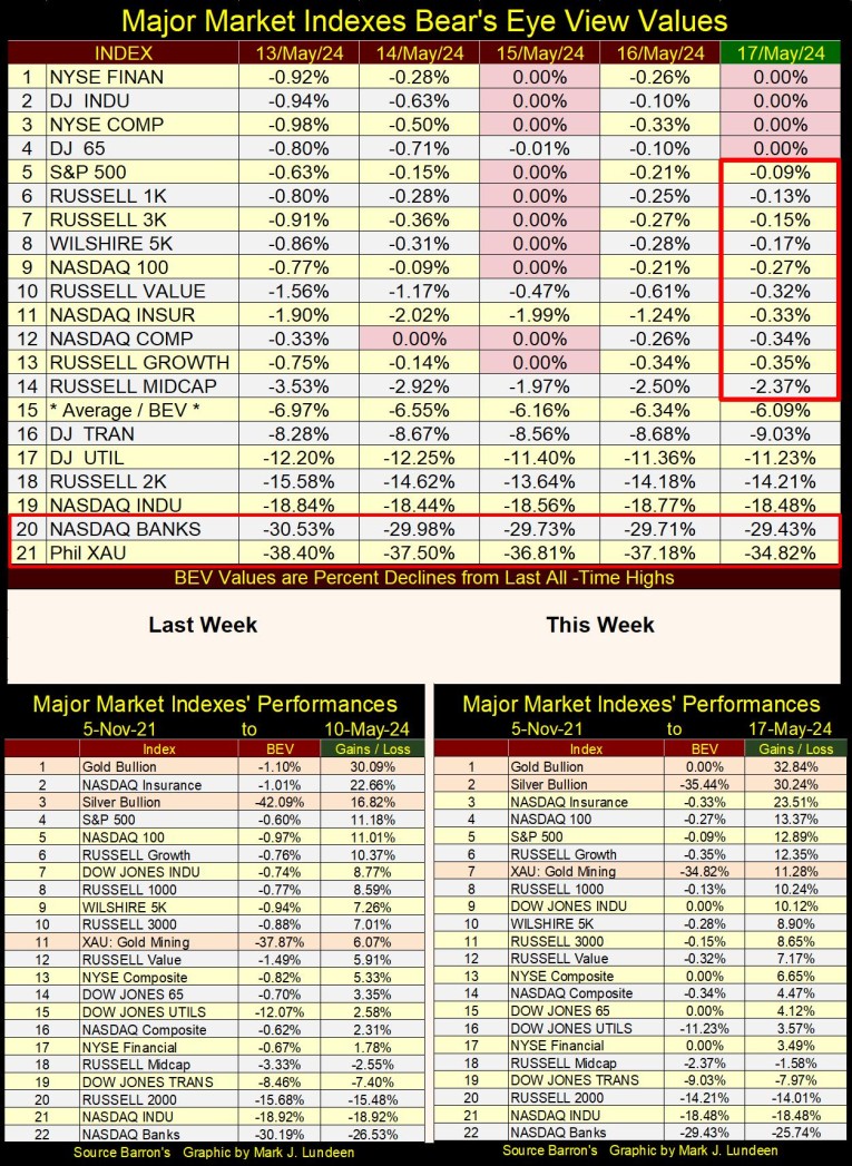 I highlighted the NASDAQ Banking Index (#20) and the XAU (#21). The XAU has been Tail-End Charlie in this table since 2011, for the past thirteen years. But all things must pass, including the gloom and doom the XAU has been mired in for over a decade. In May 2024, it looks like the miners of gold and silver are once again rising for their day in the sun. To see the XAU increase to something, anything other than #21 in the table below, will be a significant market event.