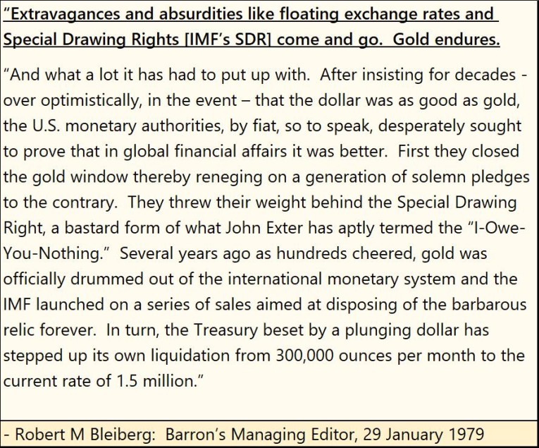 One last quote on paper money, by Robert M. Bleiberg, Barron’s Managing Editor from 1979, on the absurdities of allowing floating exchange rates, something that didn’t happen before 1971. It wasn’t until Barron’s 01 September 1975 issue before they began weekly publishing foreign-exchange rates, something that hadn’t happen before in the history of the world.