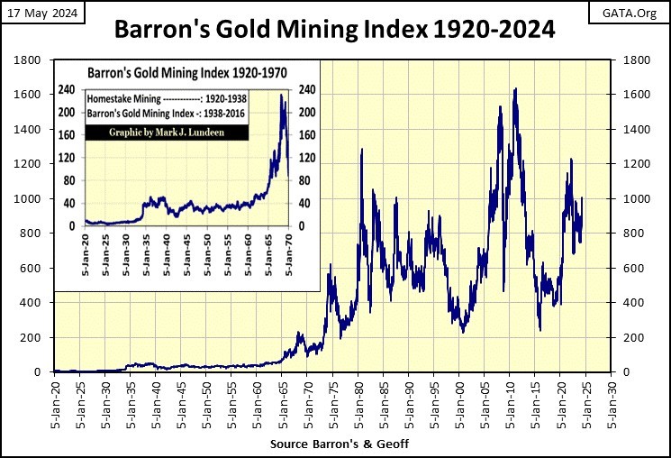 In Barron’s May 13th issue, the BGMI closed at 1004.08. To once again have the BGMI rise up to the 1.00 green line in the chart above, it would have to close at 4900. This would be an advance of 399%, and something I believe is likely for the BGMI, * IF NOT * for the Dow Jones (40,000 * 3.99 = 159,600) in the next few years.