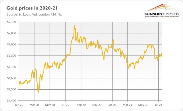 However, gold is neither soaring nor plunging. Instead, it seems to be in a sideways trend. Indeed, as the chart below shows, gold has been moving in a trading zone of $1,700-$1,900 since September 2020.