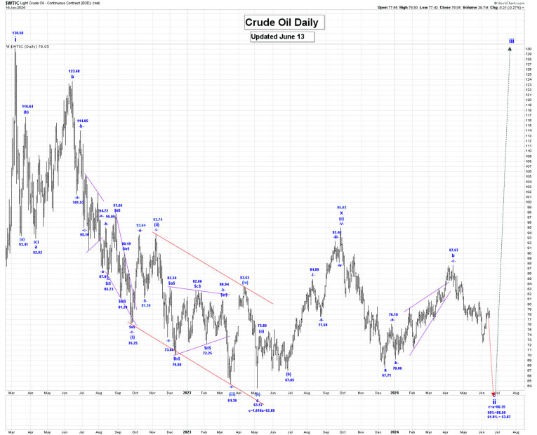 In our last Weekly Post, we introduced an alternate internal wave count for wave ii, that suggests that all of wave a ended at 63.57 and that wave b has become a bearish triangle formation with wave -a- ending at 95.03 and wave -b- at 67.71.