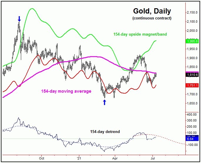 Going further with the above, an upturn with the 72-day cycle would favor additional strength into mid-to-late August, before working on a more important price peak. That peak is expected to come from the next larger wave, the 154-day component - and shown on the next chart: