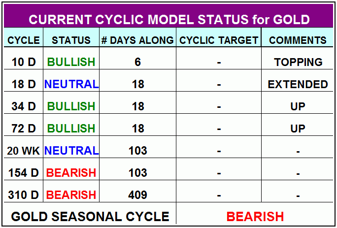 With the action seen into last week, the first thing is to take a look at the status of the cycles that we track for the gold market. The currently-viewed positioning of these cycles is shown in the table below: