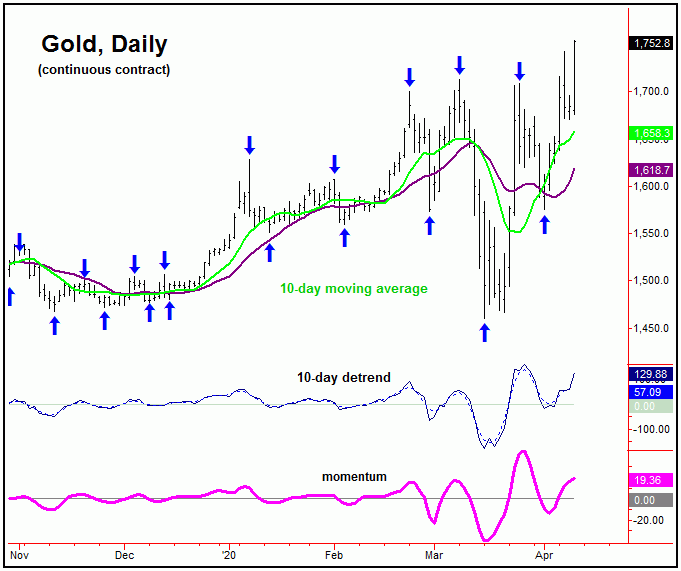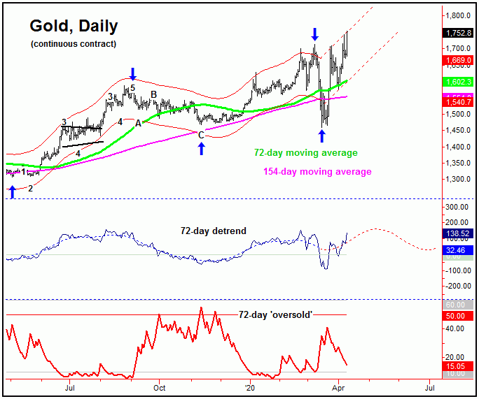 For the very short-term, the smallest-tracked wave is the 10-day cycle, which is seen as 6 trading days along - and thus should give us our next smaller-degree correction phase. With the larger 34 and 72-day cycles seen as pointing higher into the month of May, we expect the next 10-day cycle bottom to end up as a countertrend affair, holding well above its prior trough of 1576.00 - seen back on April 1st.