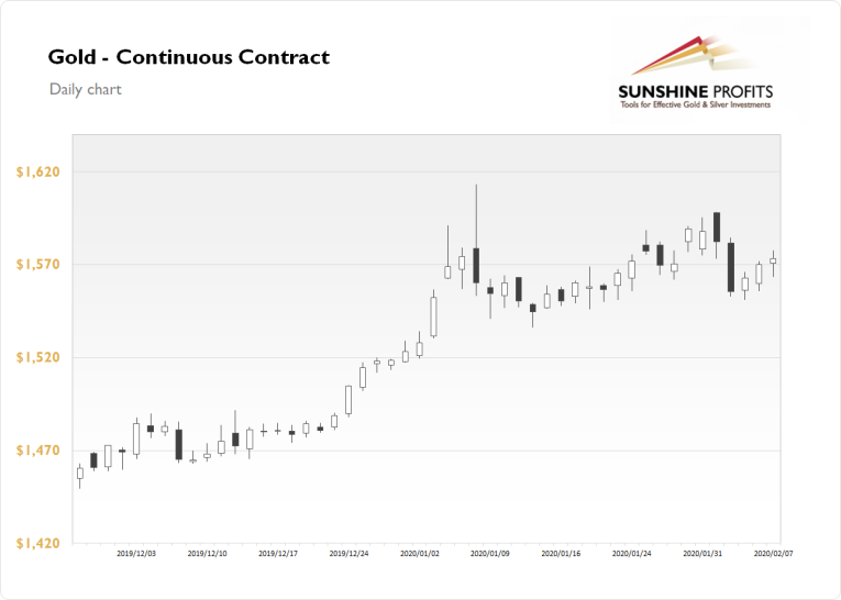 The gold futures contract gained 0.22% on Friday, as it slightly extended its short-term uptrend. The market has retraced some more of Tuesday’s decline following bouncing off $1,550 support level on Wednesday. Overall, gold continues to trade within a month-long consolidation following the early January rally over $1,600 mark.