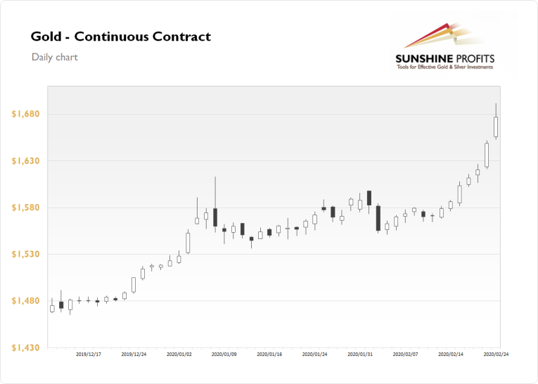 The gold futures contract gained 1.69% on Monday, as it further accelerated its uptrend following breaking above $1,600 mark. The price of gold is the highest since early 2013. Investors keep buying the safe-haven asset amid corona virus outbreak, economic slowdown fears. Today gold is retracing some of that rally following bouncing off $1,700 mark.