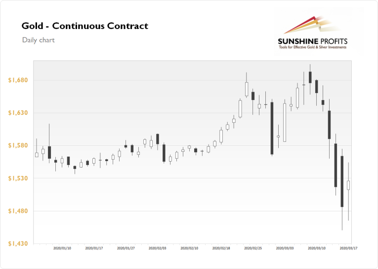 The gold futures gained 2.64% on Tuesday, as it retraced some of the recent sell-off after bouncing off $1,450-1,500 price level. Yellow metal fell the lowest since late November of 2019 on Monday, before bouncing off new medium-term low of $1,450.90. Earlier last week the market bounced off new medium-term high of $1,704.30. Two weeks ago the gold price collapsed to the local low of $1,564 despite an ongoing coronona virus scare. However, the gold price retraced all of the decline recently, as virus fears reappeared. Then on Thursday and Friday it has reversed sharply lower. Today gold is retracing some of yesterday’s rebound.