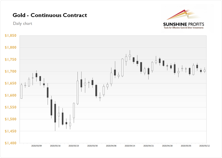 The gold futures contrac gained 0.52% on Tuesday as it continued to fluctuate within a short-term consolidation. The market remains close to the price level of $1,700. Gold is still trading within a flat correction after its April’s advance. On April 14 it was the highest since November of 2012 and the high was at $1,788.80. Since then we’ve seen some profit-taking action and a potential medium-term downward reversal.