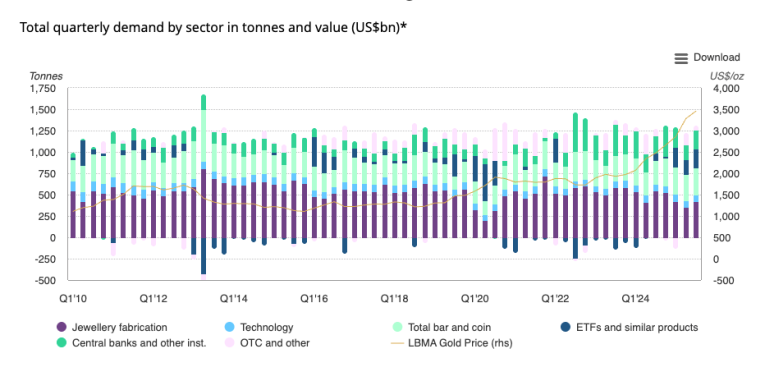 Electronics demand generally gets a bump in the third quarter as companies launch new production. However, according to the World Gold Council, the prospect of U.S. tariff hikes encouraged a surge in demand during H1 as a pre-emptive move to avoid customs levies. As a result, Q3 demand was negatively impacted.