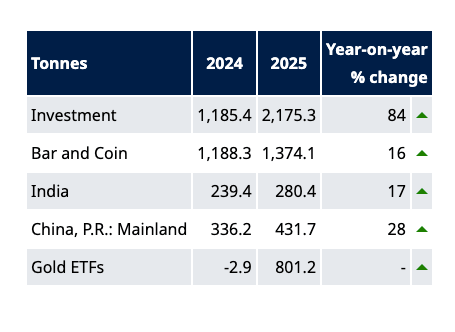 With gold hitting 53 record highs in 2025, investment demand surged to 2,175.3 tonnes, shattering the previous record of 1,805 tonnes set in 2020. Investment demand value more than doubled to $240 billion.