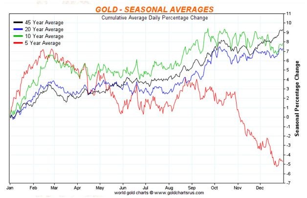 The black line tracks a 45 year average of gold prices.