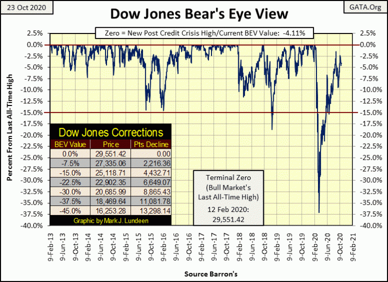 Before I get excited about anything with the market, I’d want to see the Dow Jones deflate below its BEV -15% line in its BEV chart above, or a break below 25,119 in a price chart. As I see things, a break below the BEV -15% line would suggest the FOMC is defending itself against a market mauling by Mr Bear, without much success.